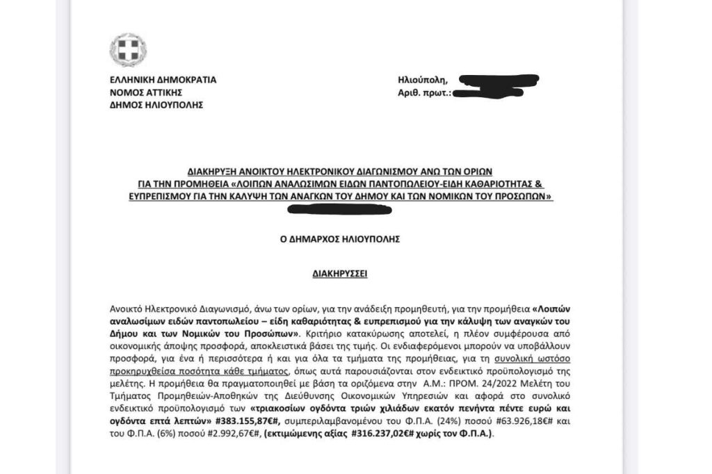 Δεν εφαρμόστηκε τώρα η ενιαία προμήθεια για όλες τις υπηρεσίες του Δήμου Ίσχυε πάντα. Παρακάτω θα δείτε κάποιες φωτογραφίες από παλιότερους διαγωνισμούς όπου φαίνεται οτι η προμήθεια γίνονταν για όλες τις υπηρεσίες του Δήμου.