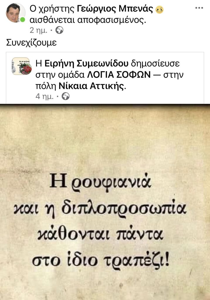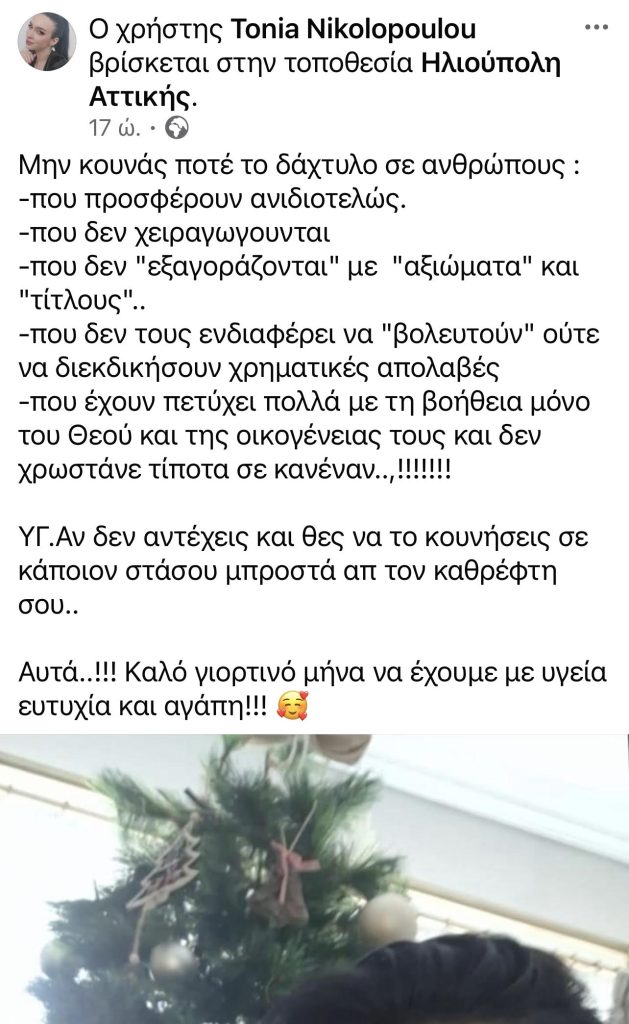 *Η Τόνια Νικολοπούλου, η οποία όταν διαφωνεί με προτάσεις της Διοίκησης (συχνά) αποχωρεί από τις ψηφοφορίες του Δημοτικού Συμβουλίου (Μετονομασία Κολυμβητηρίου και Συζήτηση θέματος Συμβασιούχων στο πρόσφατο συμβούλιο), έκανε ανάρτηση με φόντο το χριστουγεννιάτικο δέντρο και υπονοούμενα με άγνωστο παραλήπτη…