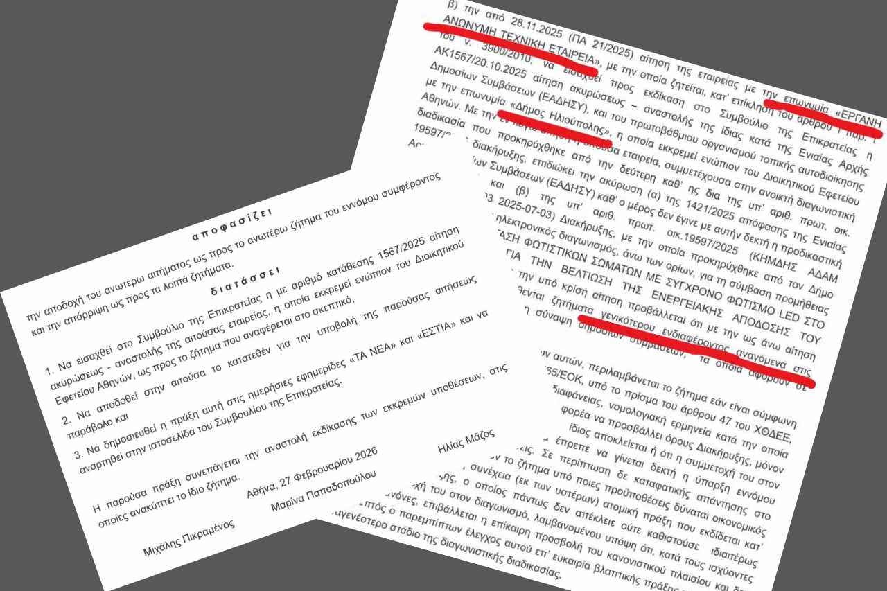 Θυμίζουμε οτι με προσφυγή της στην Ενιαία Αρχή Δημοσίων Συμβάσεων, η εταιρία ΕΡΓΑΝΗ είχε καταφέρει να ακυρώσει τον διαγωνισμό που είχε προκηρύξει ο Δήμος Ηλιούπολης. Ακολούθως η εταιρία προσέφυγε στο  Διοικητικό Εφετείο προκειμένου η υπόθεση να εκδικαστεί και εκεί, κάτι που μέχρι σήμερα δεν έχει γίνει. Αρχικά υπήρξε αναβολή της εκδίκασης (Δεκέμβριος 2025) και επρόκειτο να δικαστεί την 9η Μαρτίου του 2026, αλλά πλέον η υπόθεση έχει εισαχθεί στο Συμβούλιο της Επικρατείας, μετά από την απόφαση που παρουσιάζουμε (φωτο) και η οποία διατάσσει:
