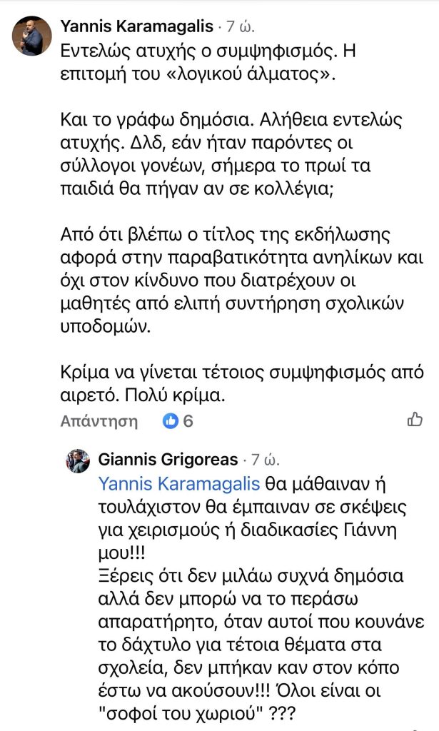 Αξίζει να σημειωθεί οτι κάτω απο την ανάρτηση του Γ.Γρηγορέα μερικοί προσπάθησαν να διατυπώσουν το αυτονόητο όπως ο εκδότης του Ilioupolinews Γιάννης Καραμαγκάλης αλλά έπεσε σε τοίχο διπλά ενισχυμένο από δύο αντιδημάρχους!