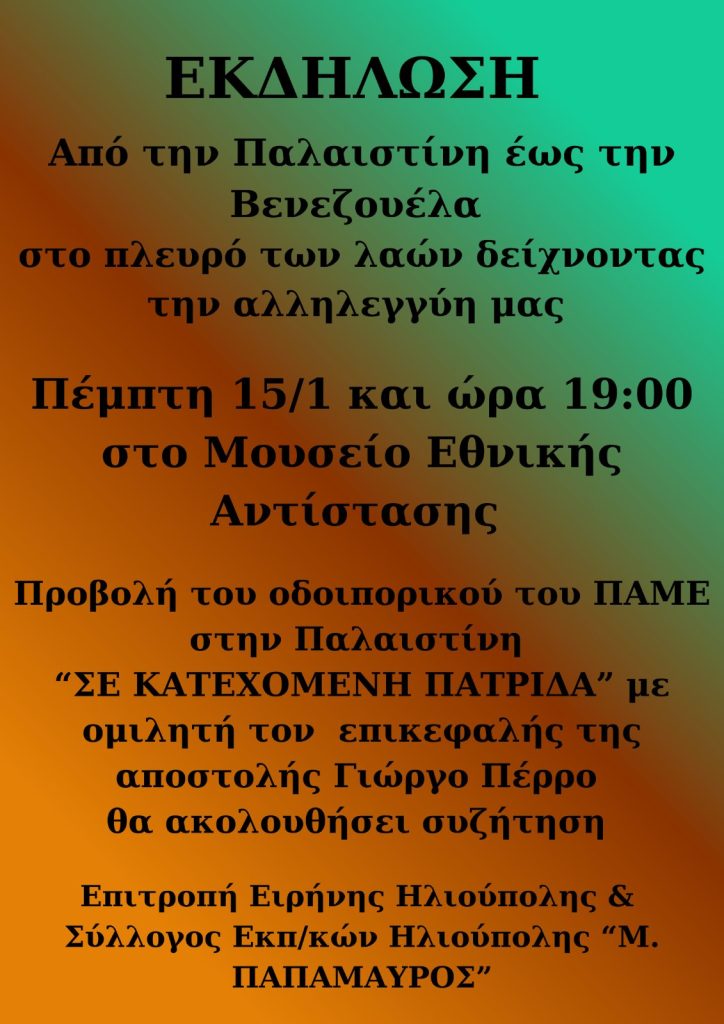 Η Επιτροπή Ειρήνης Ηλιούπολης και ο Σύλλογος Εκπαιδευτικών Ηλιούπολης Μ.Παπαμαύρος, πραγματοποιούν εκδήλωση με προβολή του οδοιπορικού του ΠΑΜΕ στην Παλαιστίνη με τίτλο “Σε Κατεχόμενη Πατρίδα“. Θα ακολουθήσει συζήτηση με τον επικεφαλής της αποστολής Γιώργο Πέρρο.