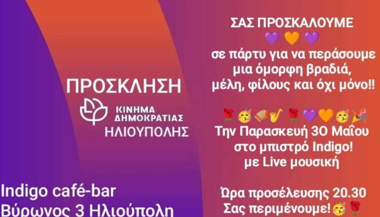 Πάρτι για μέλη και φίλους διοργανώνει η Οργάνωση του Κινήματος Δημοκρατίας στην Ηλιούπολη. Το πάρτι θα γίνει την Παρασκευή 30 Μαίου στο μπιστρό indigo (Βύρωνος 3 κεντρική πλατεία) με live μουσική. ...